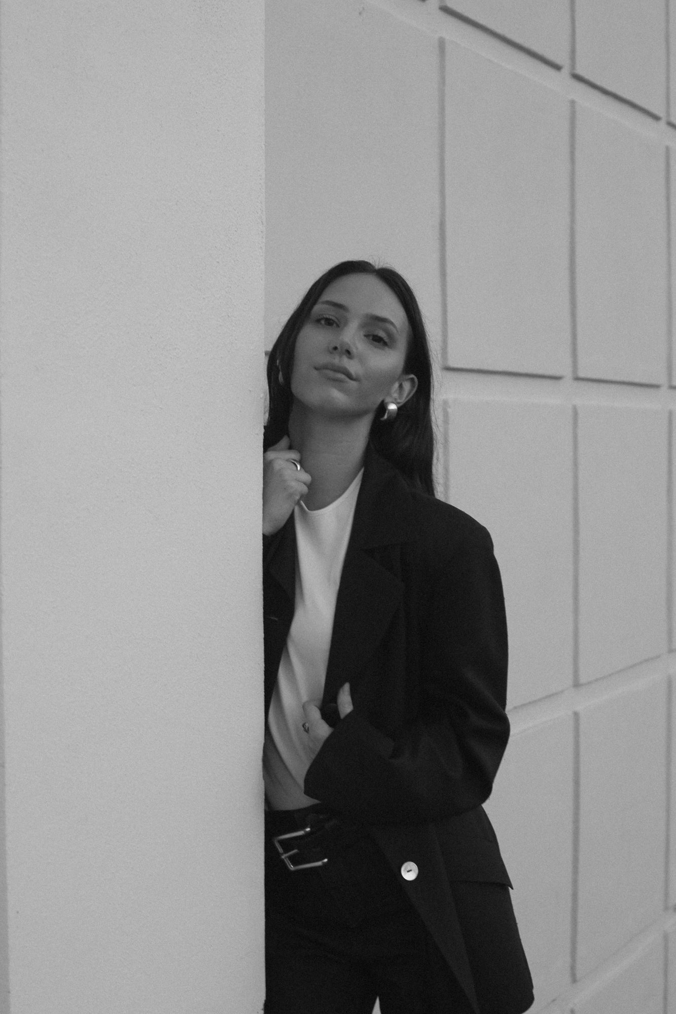Completely silk blazer in black by Sak's Fifth Avenue via the 1980s. Hss a subtle textured slub weave. Large mother of pearl buttons down the front. Functional pockets on either side. Thin integrated shoulder pads.