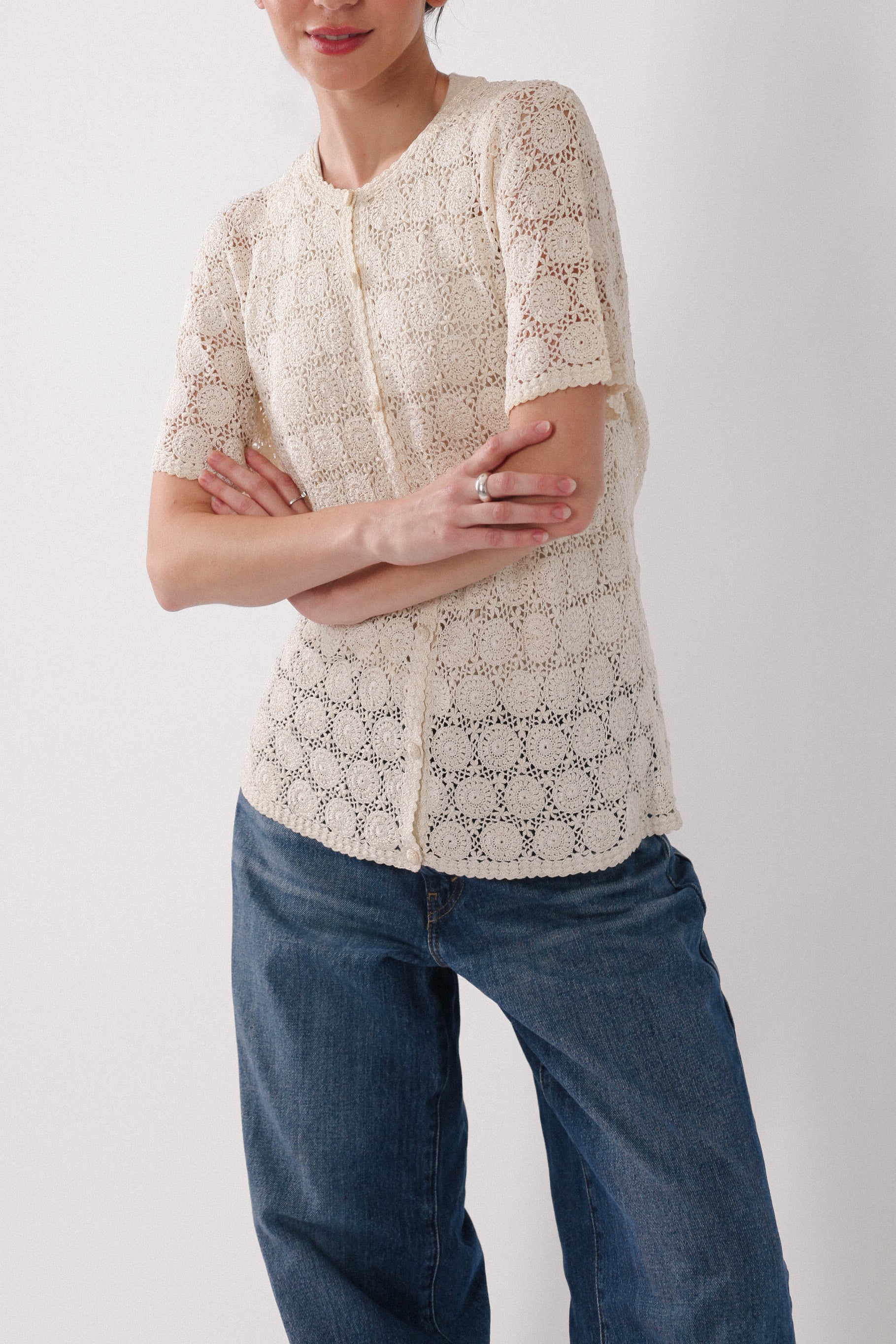 Short sleeve hand crocheted cardigan from the late 1950s to early 1960s.