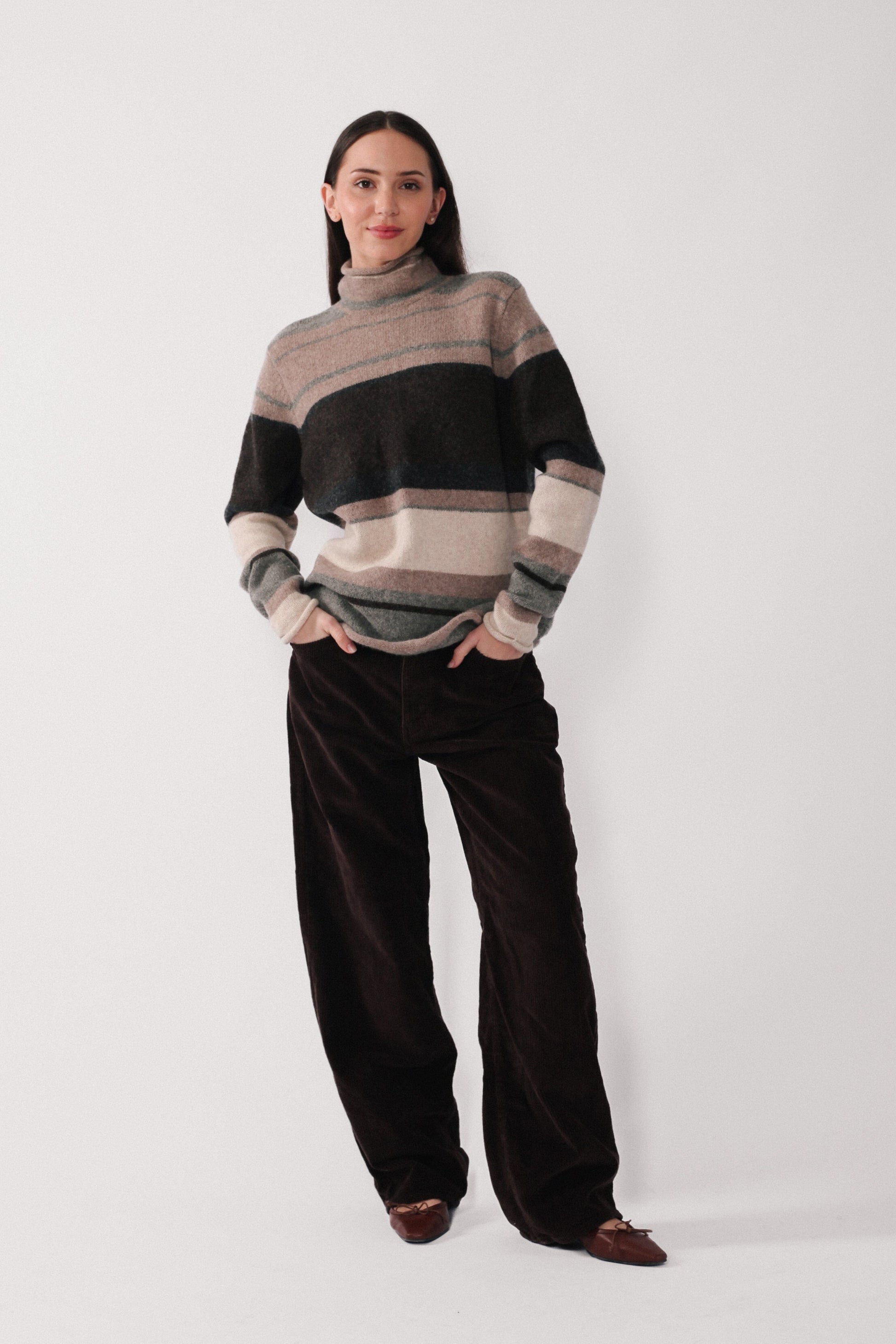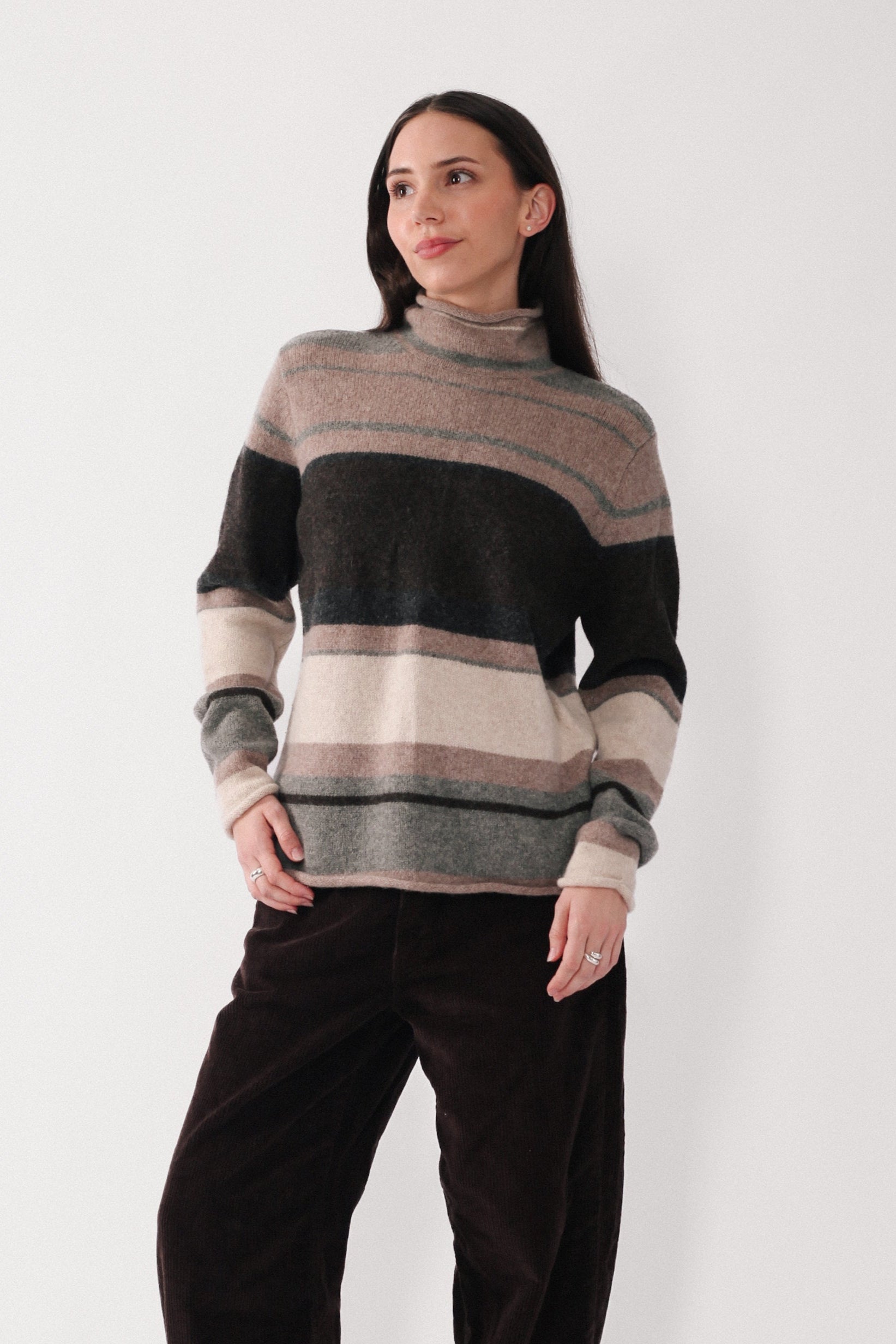 Horizontal striped wool turtleneck sweater by Gap from the late 1990s to early 2000s in various neutral shades.