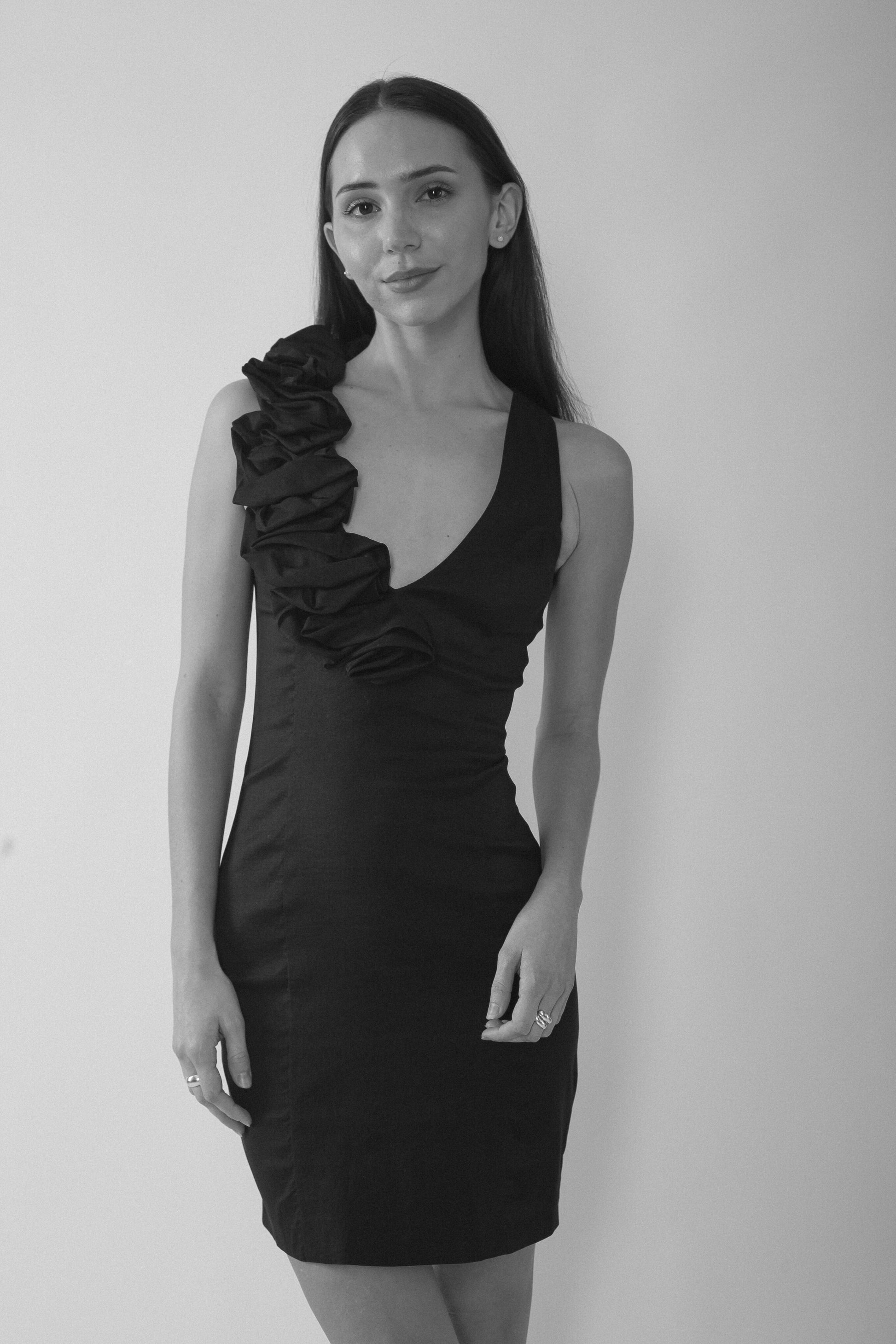 Cocktail mini dress in black with deep neckline and ruched rosette detail on one side. Zipper up the back for perfect fit.