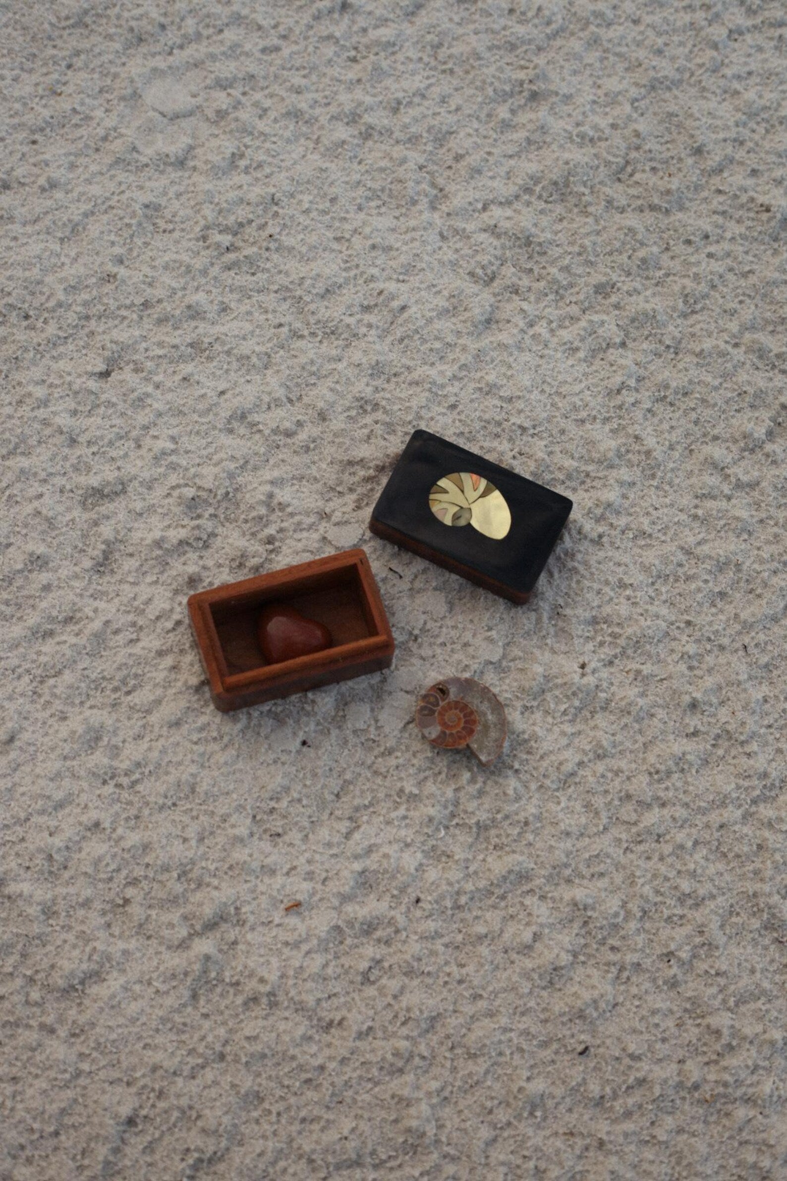 Tiny wooden box with mother of pearl and abalone shell pattern inlay lid. This was sourced with a fossilized shell and heart-shaped copper goldstone already inside ☻