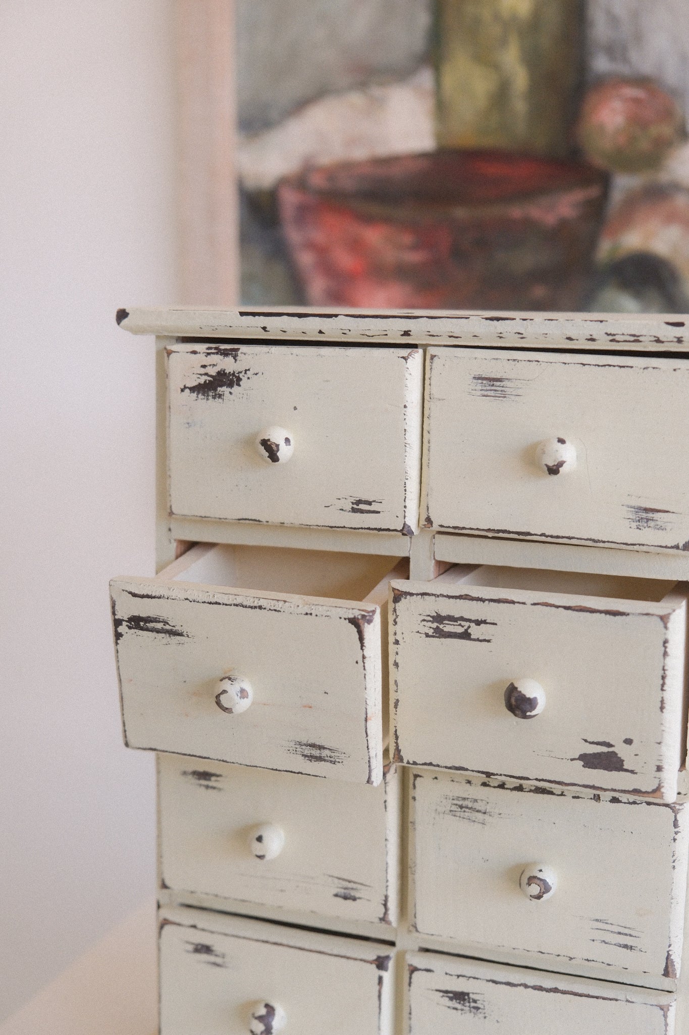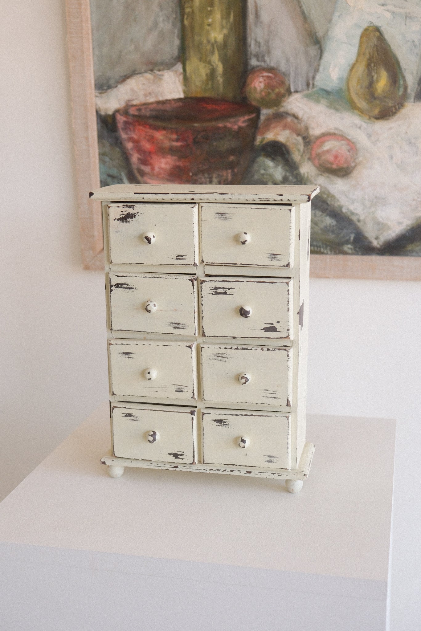 Small apothecary with eight drawers in a chippy buttercream yellow color.