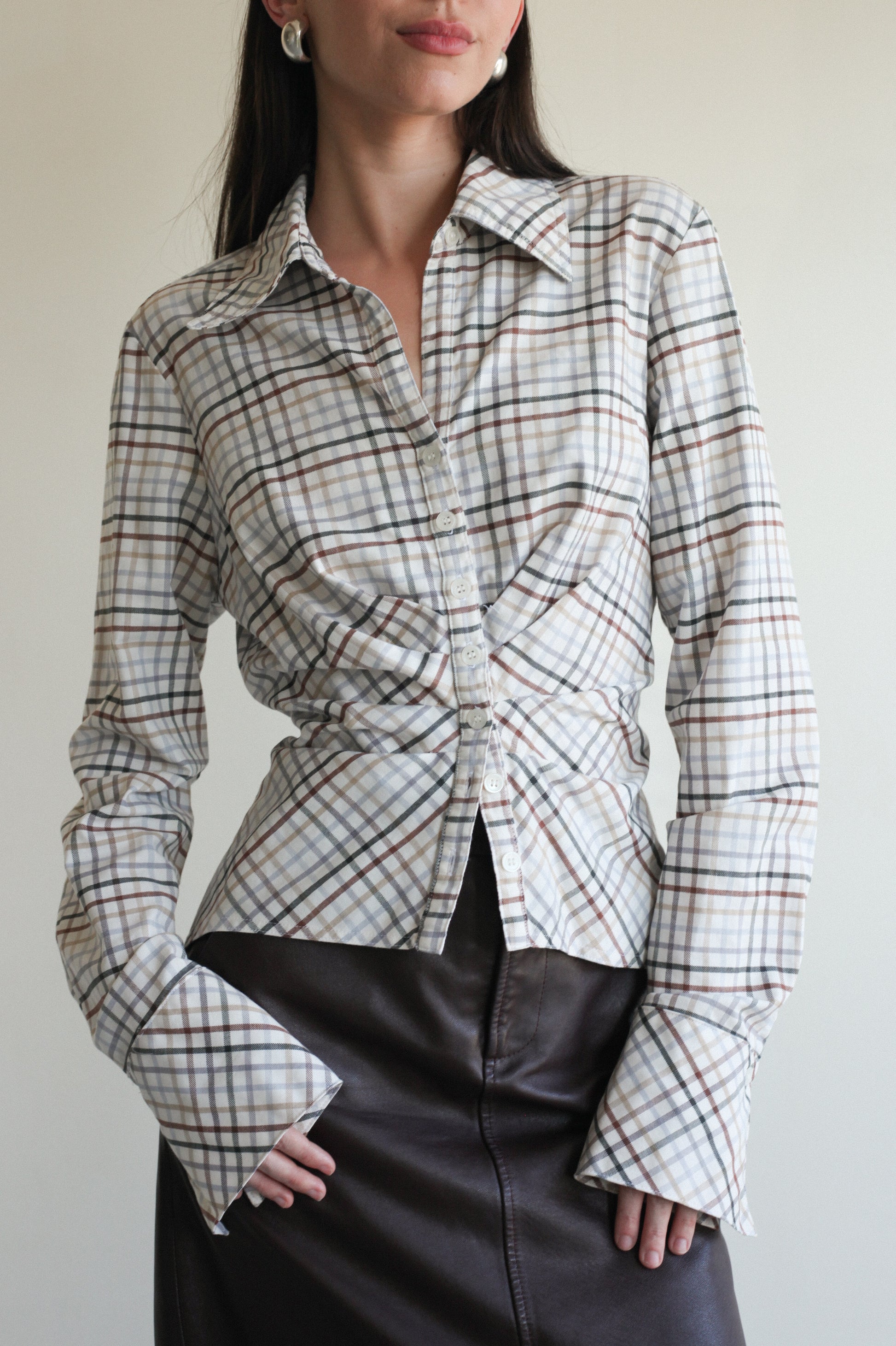 Plaid ruched button down with structured/pointed sleeves by the brand Finley from the late 90s to early 2000s. Off white base with multiple dusty colors in rust, tan, beige, slate, navy, and light blue.