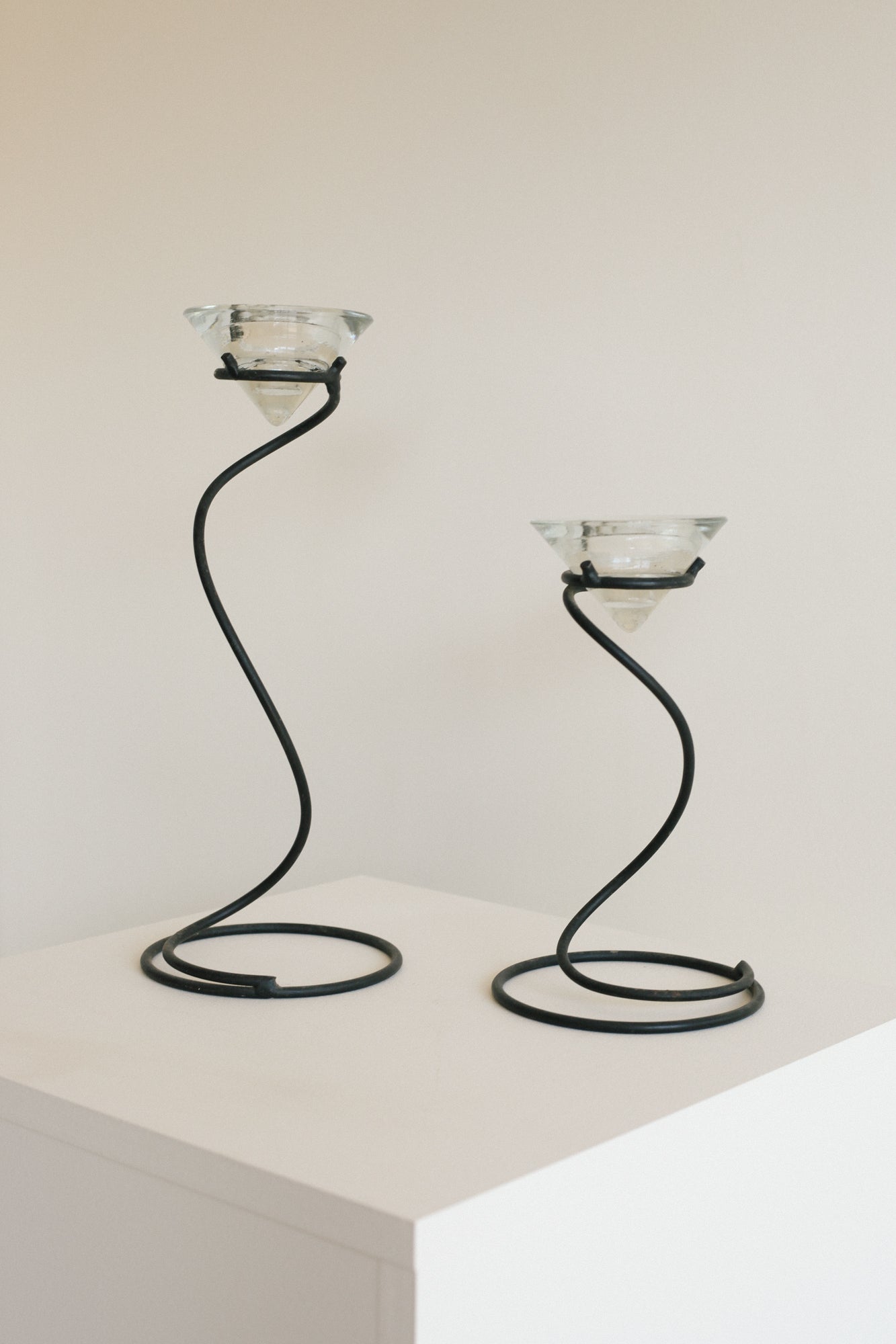 Striking pair of spiral tealight holders with glass cups and black steel frames. Each piece holds a standard tealight or tapered candle.