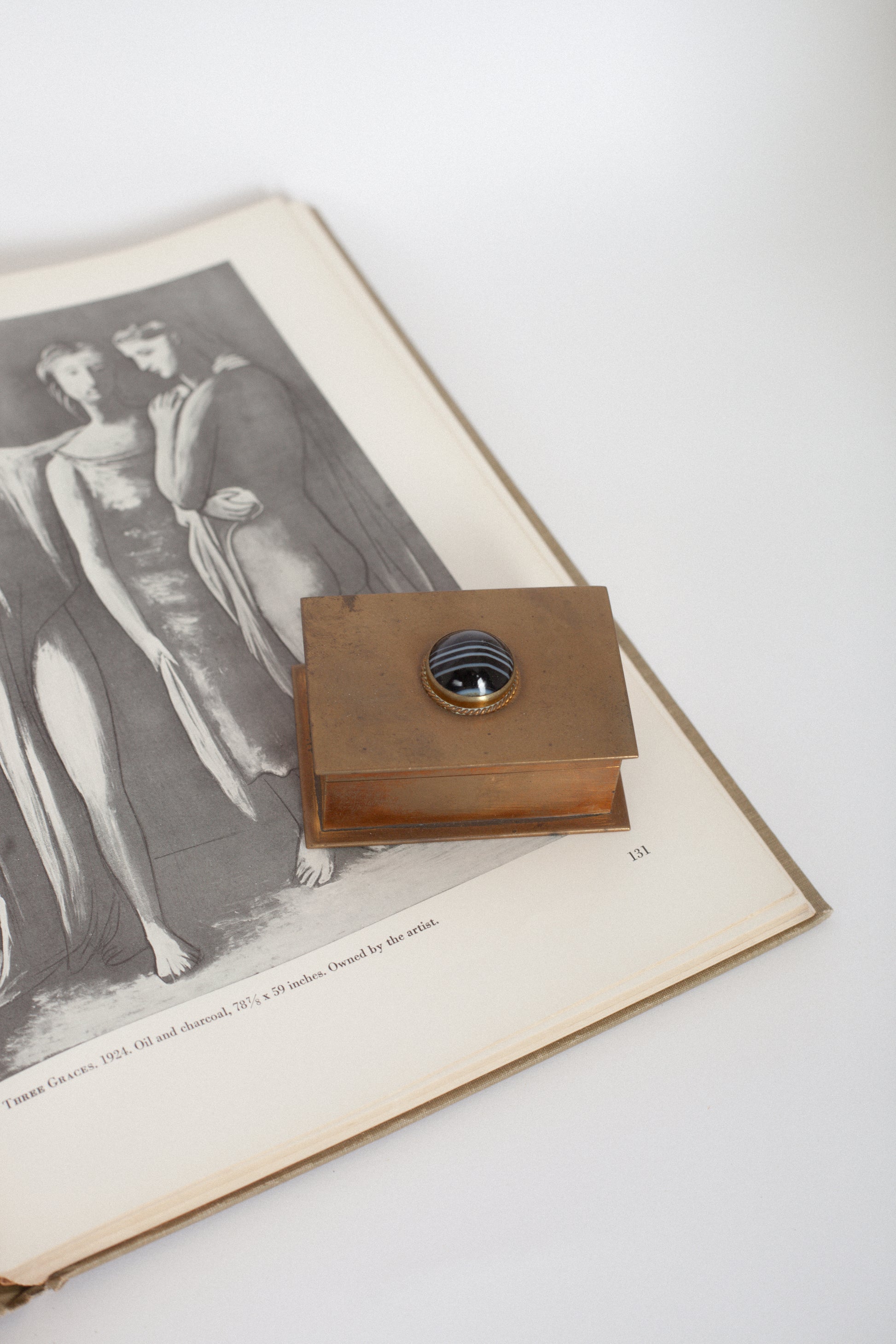 Petite brass jewelry box with a domed black-and-white banded marble inlay on the lid and a velvet-lined interior with two compartments.